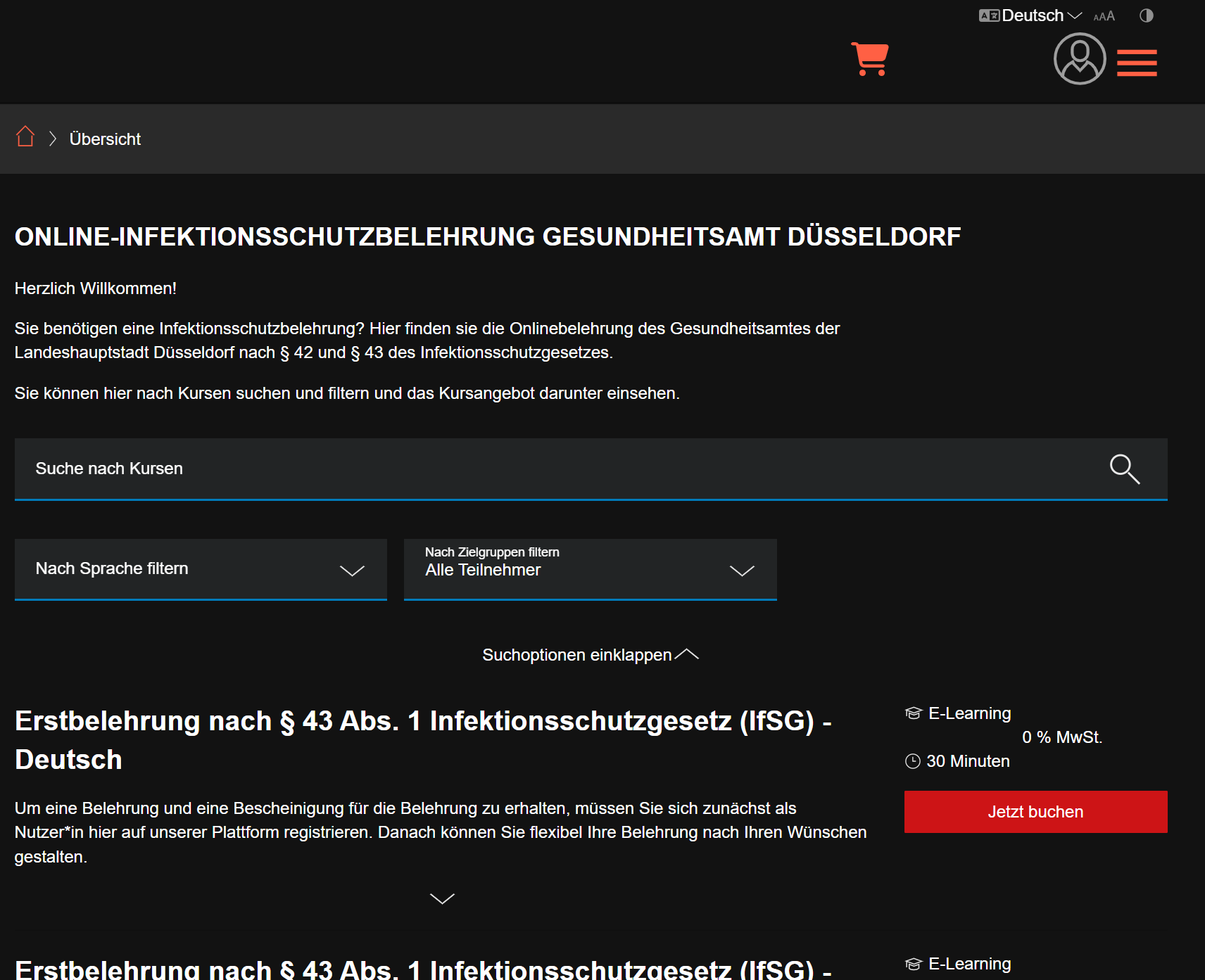 Wählen Sie Ihre Infektionsschutzbelehrung und klicken Sie auf Jetzt buchen, womit die Belehrung in den Warenkorb gelangt