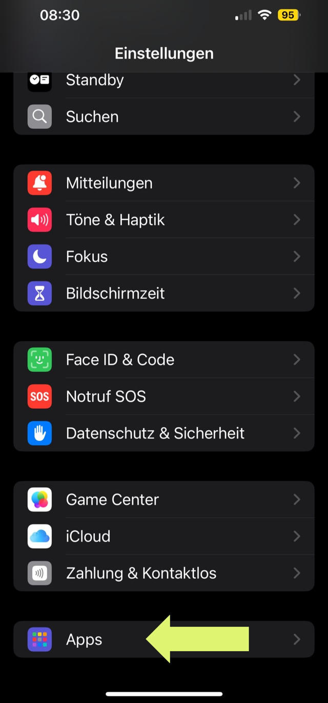Gehen Sie auf Einstellungen und scrollen Sie nach ganz unten, und tippen Sie auf Apps