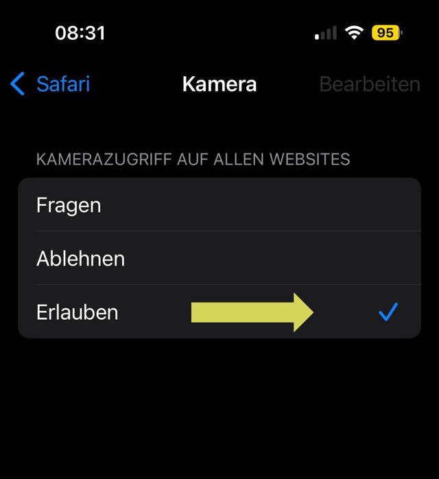 Um den Fehler zu beheben, muss in den Einstellungen die Kamera freigegeben werden.