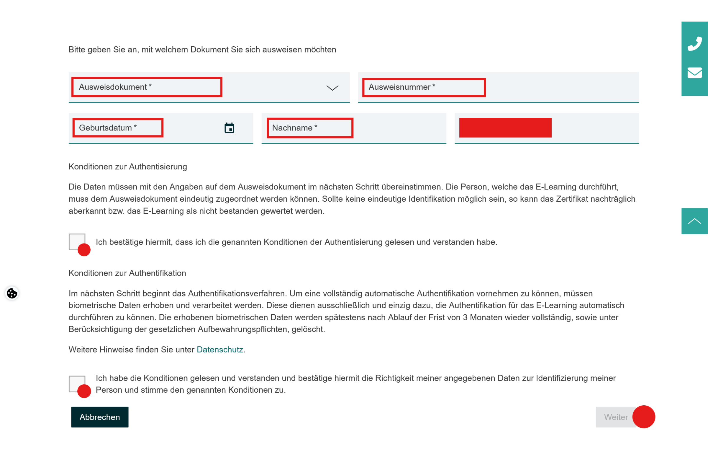 Geben Sie alle Angaben genau so ein, wie sie auf Ihrem Dokument stehen. Vorname, Nachname und Geburtsdatum müssen mit den Daten, die Sie bei der Registrierung eingegeben haben übereinstimmen.