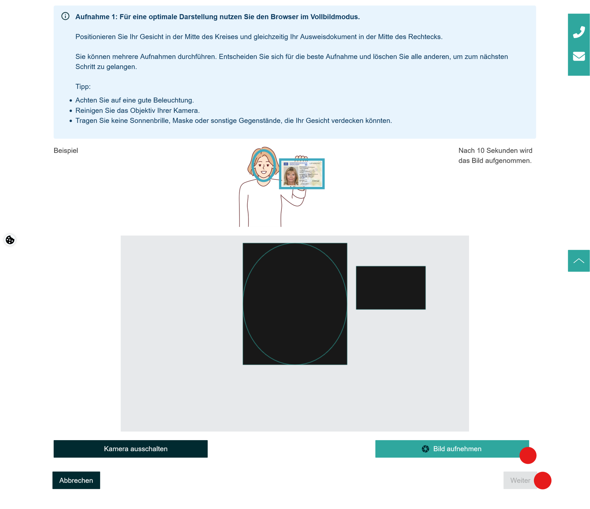 Richten Sie sich gut aus, nehmen Sie das Bild durch Klick auf den Button Bild aufnehmen auf. Ein Timer startet, der Ihnen 10 Sekunden Zeit gibt, um sich wie im Beispiel vor Ihrer Kamera zu platzieren.