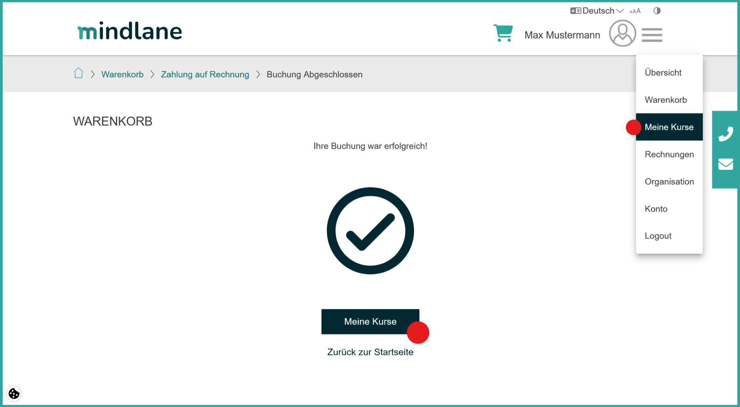 Sobald Sie die Online Belehrung gebucht und bezahlt haben, können Sie die Authentisierung starten. Dafür klicken Sie im ersten Schritt auf den Button Meine Kurse. Alternativ können Sie auch rechts oben über das Burgermenu zum Button Meine Kurse gelangen.