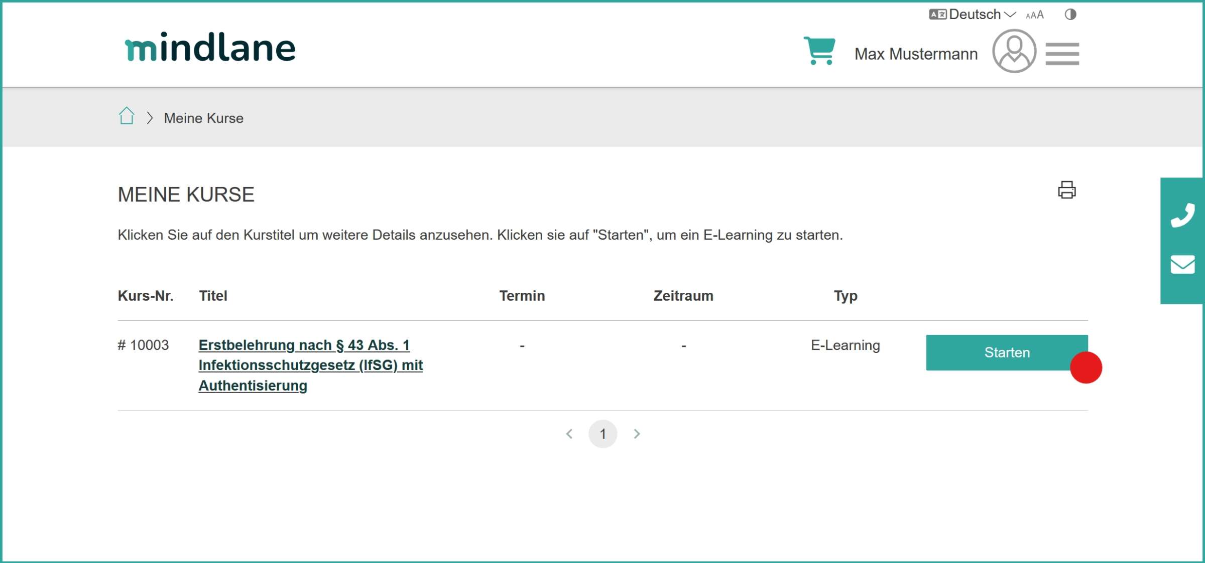 Klicken Sie anschließend auf den Button Starten neben Ihrer gebuchten Belehrung.